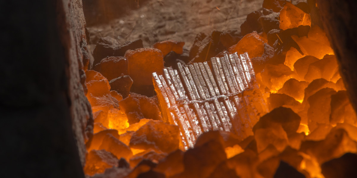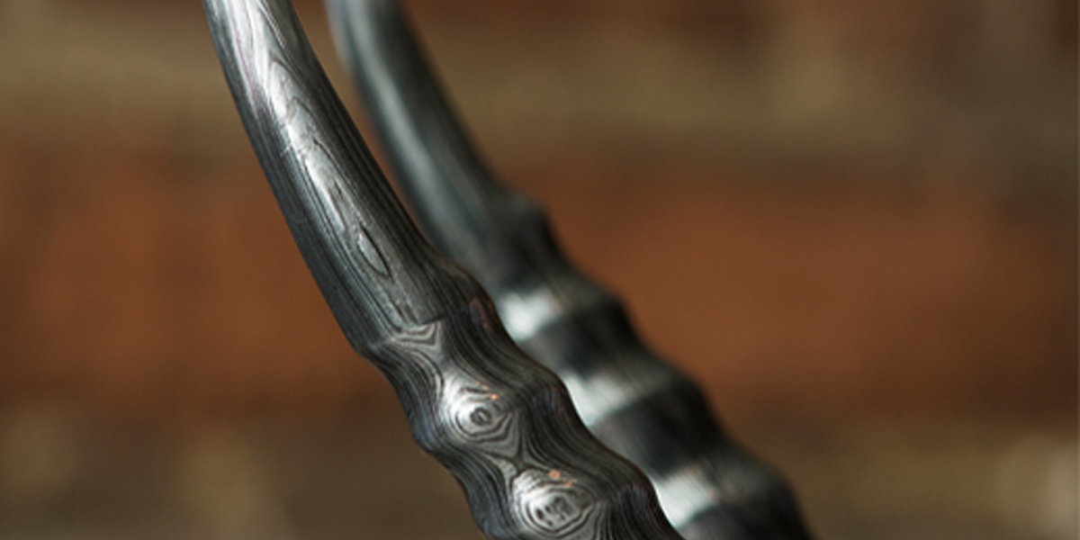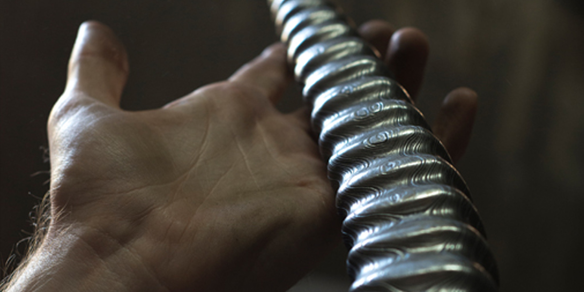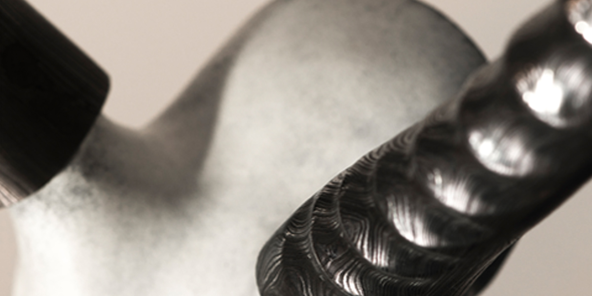 Firstly you select your steels by choosing which qualities of each are important in the finished product. Traditionally, in sword making, this decision would effect the use of the blade - a high carbon steel taking a sharp but brittle edge, and a softer steel in support to add flexibility. In sculpture however, the steels I choose to use are for their cosmetic values; to create the highest contrast and most striking patterns, I use a combination of two steels very different in composition. The high carbon choice of steel gives you the darker layers in the finished piece, where I steel high in nickel will act as a highlight and remain shiny when polished. Once the steels have been chosen, you then decide on how the layers will be put together. The choice of how to alternate between layers of each steel will have a direct effect on how the outcome of the piece. When the steels have been chosen and the layering options decided upon, the forging begins. The steels are stacked and put into the forge until they are heated all the way through to around 1,700 degrees fahrenheit . They are then hammered together using a power hammer, where the combination of extreme heat and pressure forces all the layers into one. When the layers are fully welded together, they are then stretched out to double the original length and folded back on themselves. This process is repeated until the original ten or so layers becomes around two to three hundred. The more layers, the finer the pattern. Once the desired number of layers is achieved and the bond between them is strong enough to manipulate without splitting, the basic shape of the horn is formed by hammering the steel by hand over an anvil. From this point, all curves, ridges and finer details are achieved by grinding. The grinding process fundamentally cuts through the layers, revealing each one as you grind deeper. By adjusting the angle of the grind, you can alter how many layers are revealed in any given area. A steep angled cut into the metal will reveal many layers at once and the pattern will be of fine detail, where as a shallow angled grind will display the layers on a more even level and each one will be more prominent. When all the grinding is complete and the horn is fully formed, the layers are invisible and the steel appears to be made from one single piece. It is only when the horn is submerged in acid that the pattern is etched and revealed. He and his skilled craftsmen risk their bare hands on hot metal, sparks flying everywhere as they grind into the layers of steel to create the natural contours of the horns. The family he works alongside are master craftsmen and have been forging weaponry and armor for generations, therefore their knowledge and expertise are beneficial to the project. They are fascinated by Stephen's ideas and by his ability to work in their medium, as well as in their conditions - sometimes 40 degrees centigrade outside the workshop. The admiration and respect is reciprocated and Steve is as entranced by their methodology and primitive tools yet deep-rooted skills as they are in his broad-minded ideas and gumption. Stephen's passion for this project has therefore grown in a way he could never have pictured at the outset - it means more to him now then ever, and every trip to stay with his Indian comrades, his relationship deepens as they thread together their skills and create what is part of a fascinating and truly unique project that the world has ever seen. Side by side the two contrasting cultures work together to manipulate heavy, hot metal, by hand, physical strength and testing. In the hot, dusty workshop, they sweat with faces burning from being so close to the cherry red metal and the coals of the forge whilst the heat of the sun falls on their shoulders. The elegance of the finished piece is enhanced by the enchanting story of collaboration, contradiction, hard work and craftsmanship.